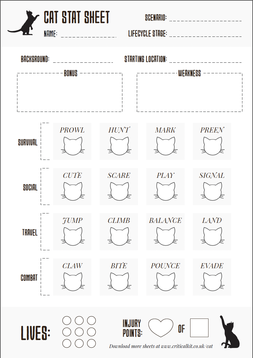 THE FIRST THING you'll do is to create your kitten. There are step-by-step guidelines in the rulebook for filling in your character sheet. You must choose a cat archetype from feral, stray and pet. You can also customise your breed and some of your skills. Finally, you'll need to do the essential part of making your moggy... giving it a name.