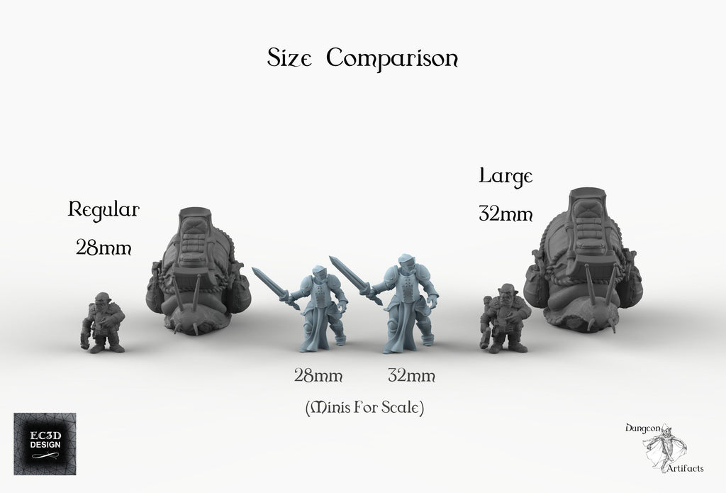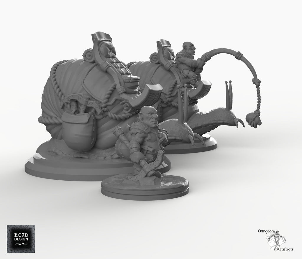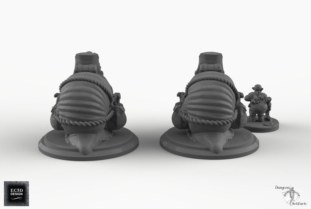 The Snail-Riding Gnome is a detailed collection of miniatures for your tabletop role-playing and wargames, available as a set or piecemeal. Great for adding definition to any fantastic forest or subterranean scene, the Snail-Riding Gnome also makes a solid backbone for a memorable one-off encounter in an RPG. In the 28mm scale, the snails measure approximately 2.5"x2"x1.75" and stand on a 2" base (3"x2.25"x2", on a 2.33" base in the 32mm scale). The gnome is approximately 0.75" on a 1" base in the 28mm scale (1" on a 1.25" base in the 32mm scale)