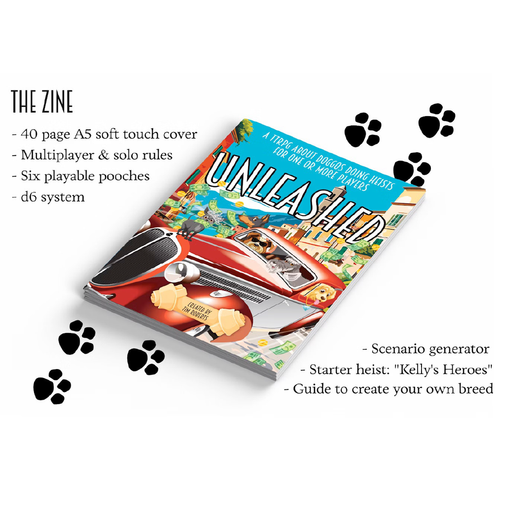 From the award-winning creator of Be Like a Cat and Be Like a Crow comes a game about our best animal friends. This quick-to-learn TTRPG can be played solo or as a kennel crew and requires no GM. Grab some six-sided dice and prepare to get heisting.