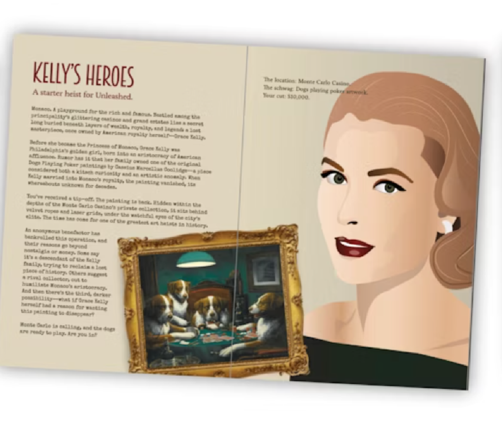 In this phase you find out whatyou need to steal, who you are stealing it from and where it is located. The book has plenty of heists in the form of rollable tables, as well as a starter scenario, Kelly's Heroes. You can also create your own custom crime caper.
